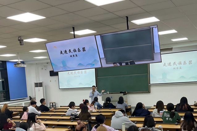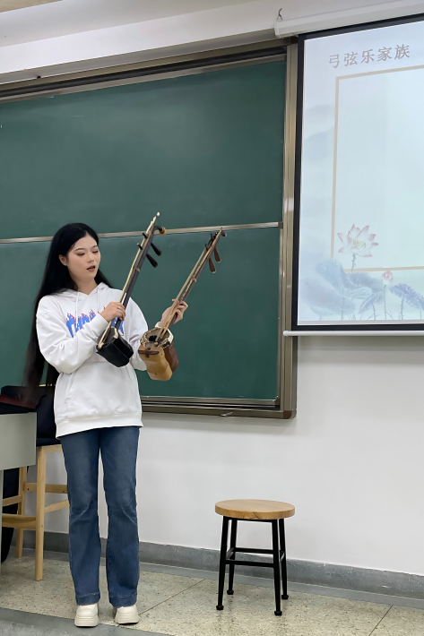 随后,李琼老师介绍了胡琴的历史以及诸多形制各异的拉弦乐器构成的胡琴家族。在讲授过程中,李老师通过演奏《兰亭序》《光明行》等乐曲展示了二胡、中胡、大筒的音质音色及蕴含的不同感情色彩,台下学生们沉浸其中,掌声不断。
