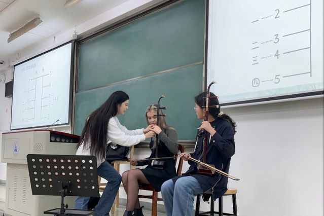 (通讯员:田丽华、王耿)2025年10月14日,国际教育学院王耿老师在文泰楼319教室举办了一次“中国非遗技艺进课堂之胡琴艺术”体验活动,该活动依托于我校本科通识选修课《中国非遗技艺欣赏与实践》,100余名中外学生共同参加了此次体验活动,该活动邀请到武汉音乐学院中国器乐系李琼老师进行实践指导。