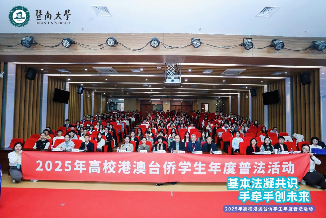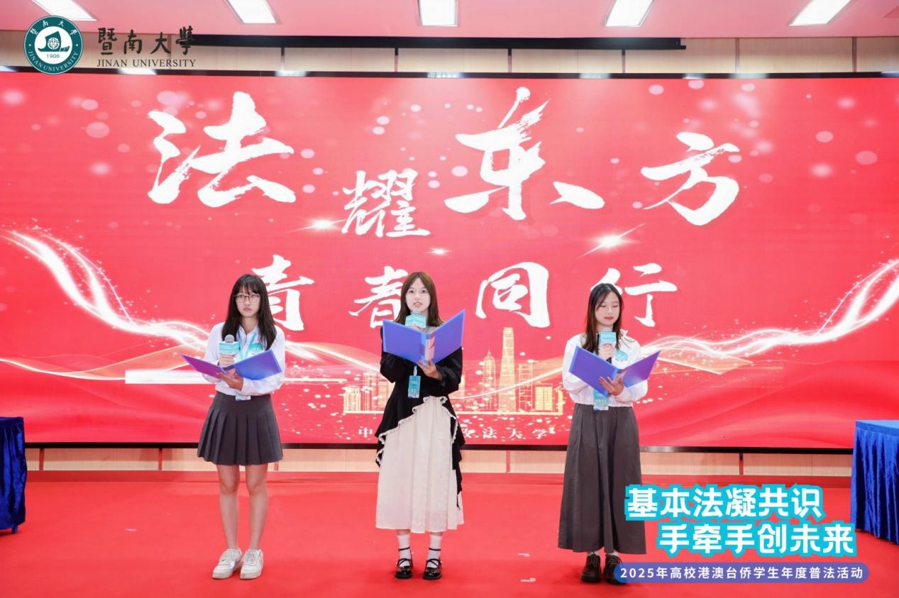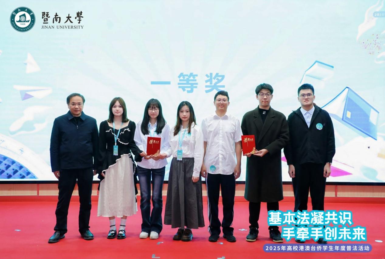 2025年12月26日,由暨南大学承办的“2025年高校港澳台侨学生年度普法活动”线下决赛在暨南大学番禺校区邓祐才学术报告厅圆满落幕。我校港澳台学生组成的代表队凭借扎实的法律知识功底、默契的团队协作与出色的现场表现,在全国众多参赛队伍中脱颖而出,成功斩获一等奖,充分展现了我校港澳台侨学子的法治素养与青春风采。