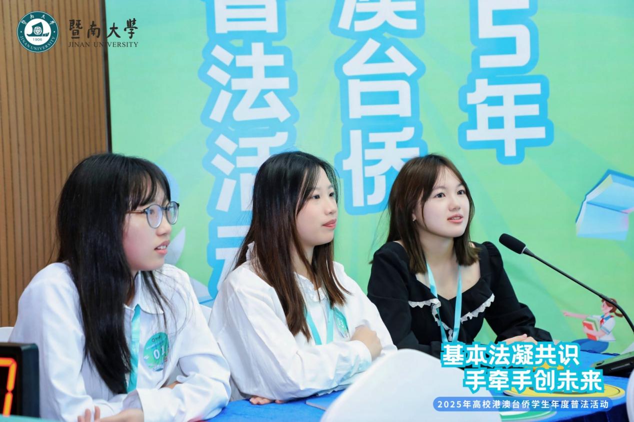 决赛现场氛围热烈,环节设置丰富且极具挑战性,分为“基本法与我”主题展示、极速问答及最终对决三个环节。在“基本法与我”主题展示环节,我校代表队紧扣活动主题,借鉴往届参赛经验,以生动的演绎形式,结合自身求学经历与对法治精神的理解,深情诠释了宪法、基本法与青年成长的紧密联系,传递了港澳台侨学子对“一国两制”方针的坚定拥护,赢得了评委与现场观众的一致认可。