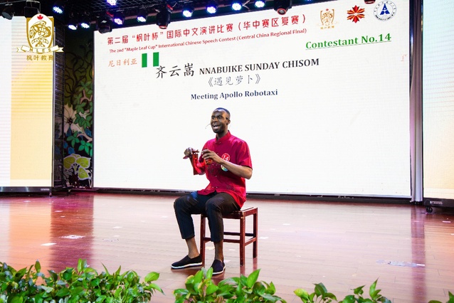 在比赛中,我校四位国际学子各展风采。来自尼日利亚的齐云嵩以《遇见萝卜》为题,用幽默诙谐的语言讲述了自己与武汉无人驾驶出租车“萝卜快跑”的趣事。他从最初的“内心抗拒”到亲身体验后的“靠谱”感受,穿插武汉方言和快板表演,生动展现了中文学习的乐趣和对中国科技发展的真切观察,赢得评委一致好评,最终荣获特等奖。