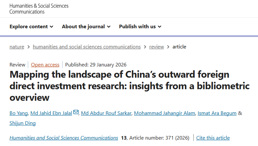 近日,我校经济学院孟加拉籍博士Md Jahid Ebn Jalal在杨波教授的指导下,以通讯作者身份在国际权威期刊《Humanities&Social Sciences Communications》(Nature旗下人文社科领域子刊)发表学术论文,题为《Mapping the landscape of China’s outward foreign direct investment research: insights from a bibliometric overview》。这是我校国际学生群体在国际顶尖学术平台取得的又一标志性成果,也是学校国际化人才培养与科研创新能力的重要体现。
